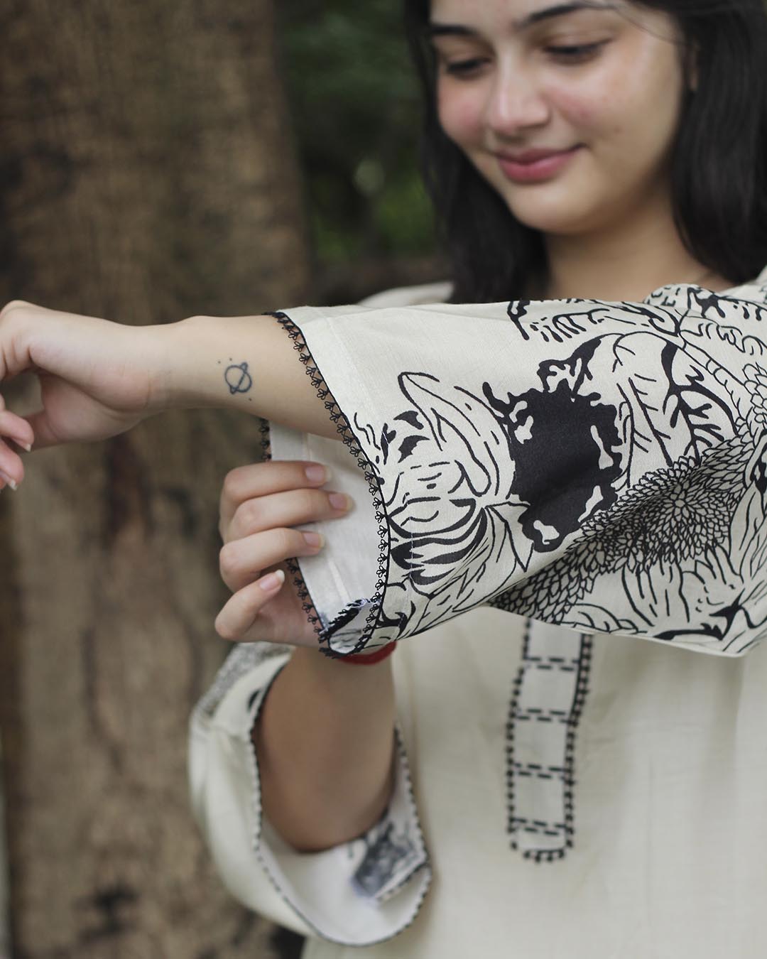 Print: Floral scattered print on Top , Stripes print on Bottom ( Base - Ivory )
